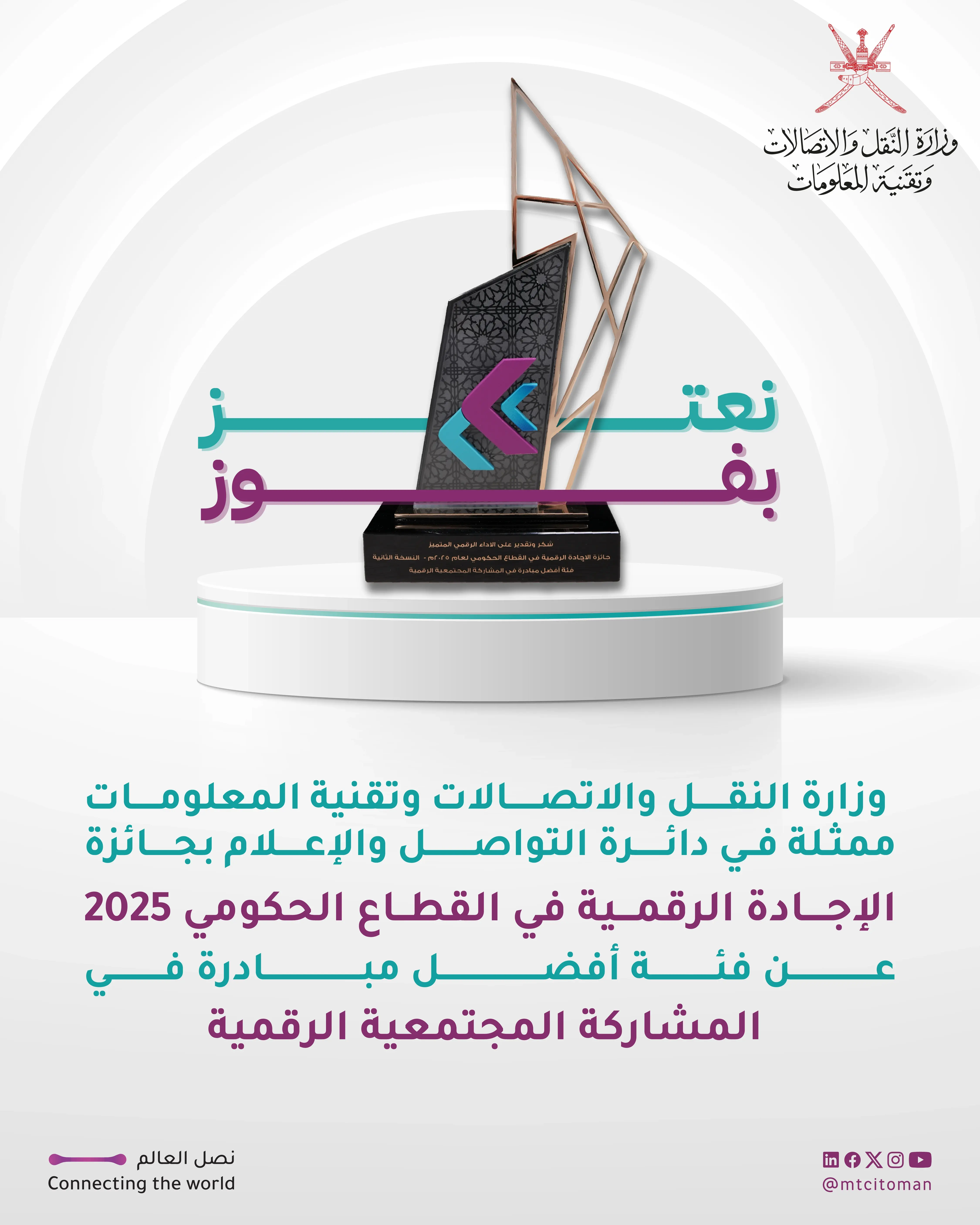 The Communication and Media Department at the Ministry of Transport, Communications, and Information Technology won the award for the Best Initiative in Digital Community Engagement. The award was presented during the ministry's ceremony announcing the winners of the second edition of the Digital Excellence Award in the government sector 2025, as part of the "Together We Advance" forum in its fourth edition.