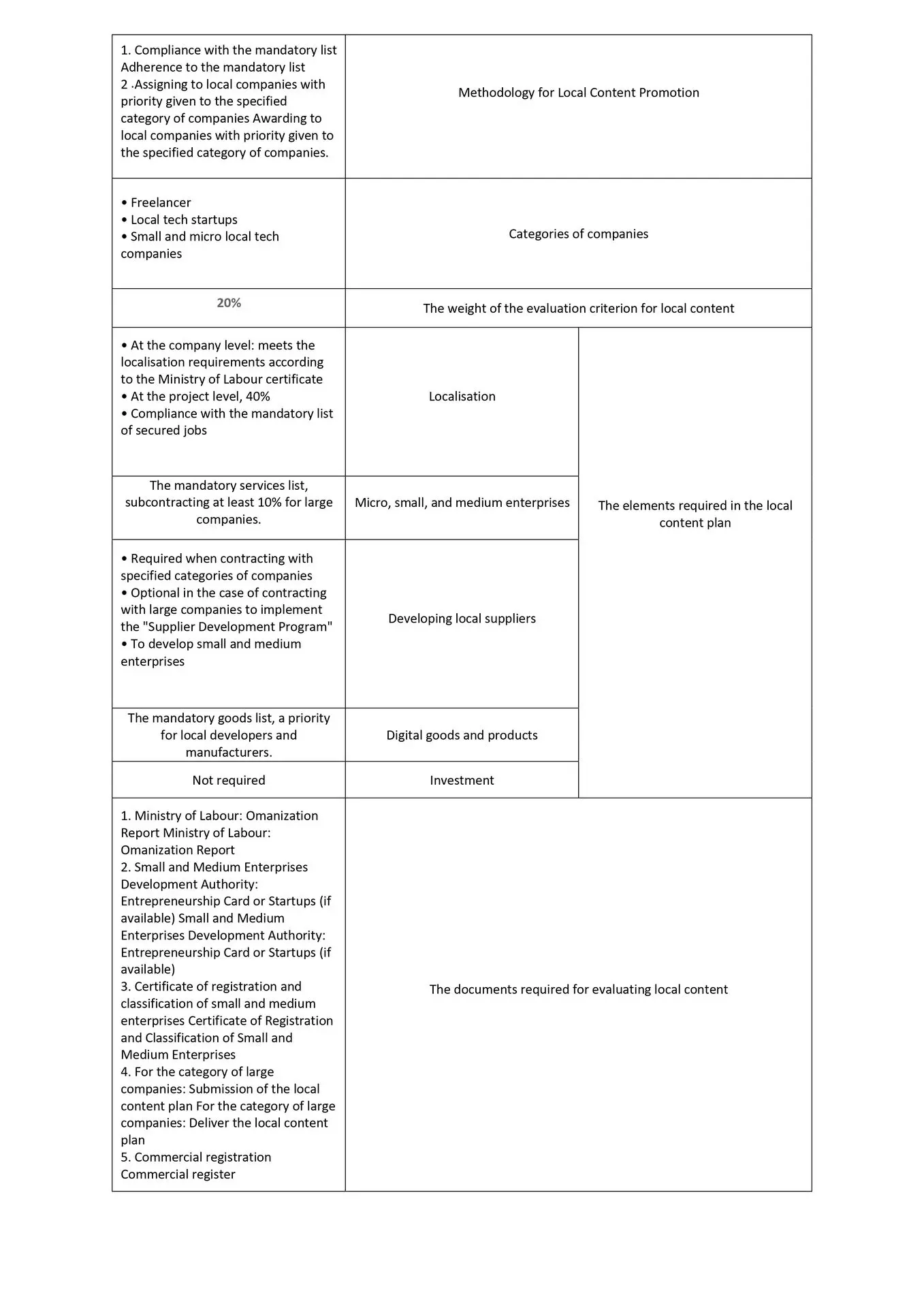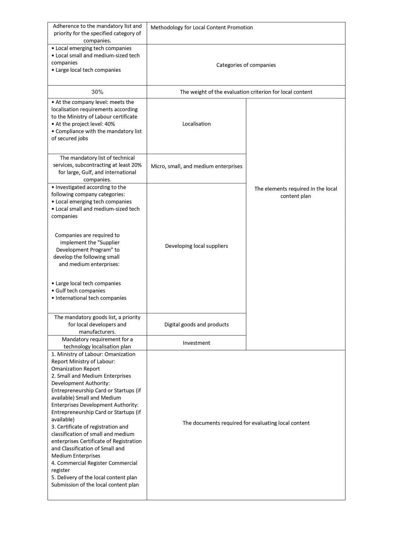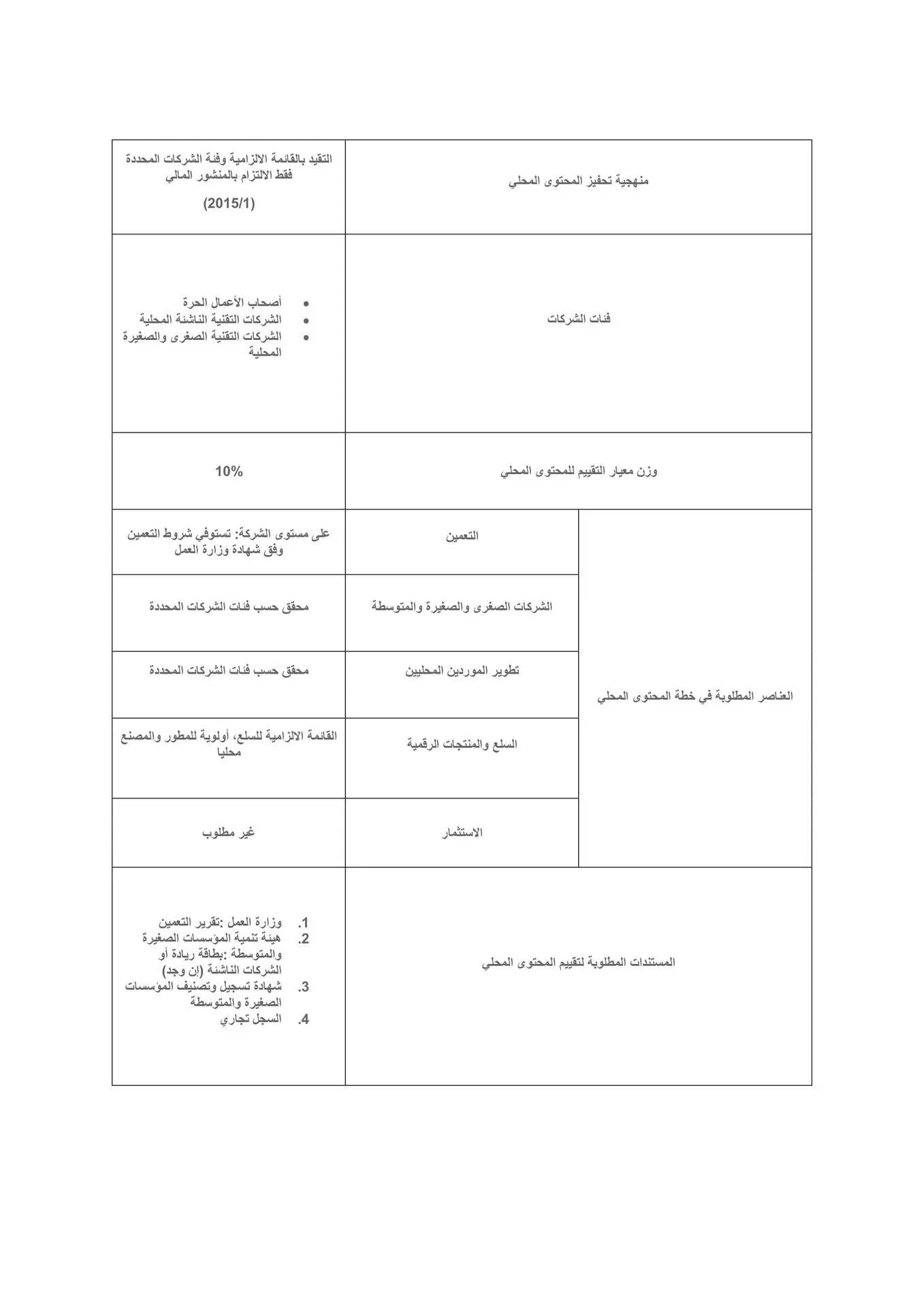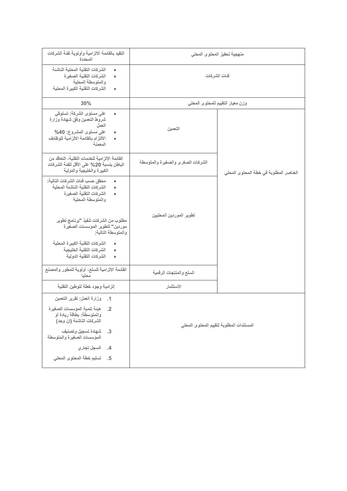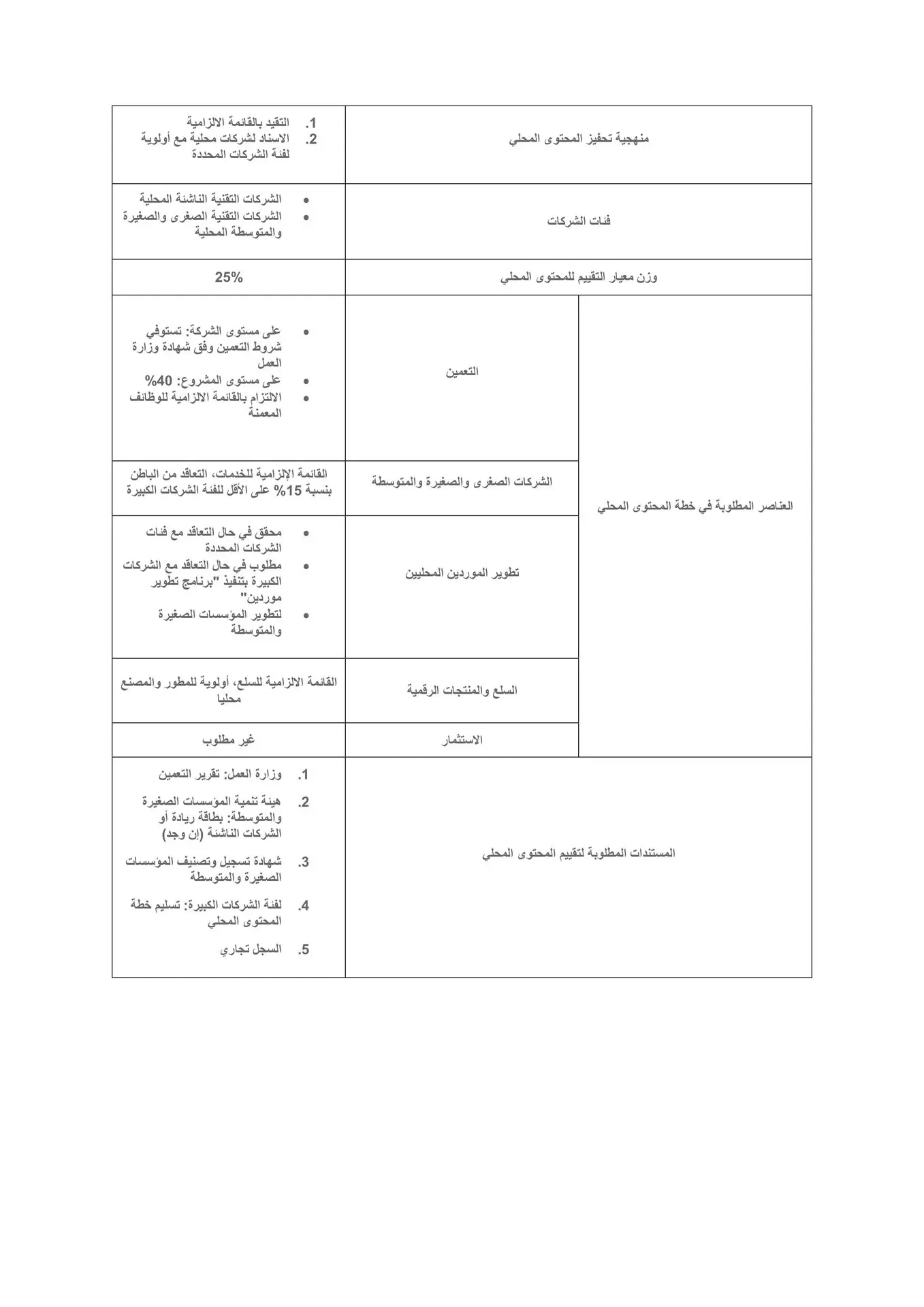 يمكن الرجوع الى جدول الضوابط وبناء على موازنة المشروع يتم تحديد العناصر المطلوبة في خطة المحتوى المحلي. الجدول التالي يوضح عناصر المحتوى المحلي مع الوصف: