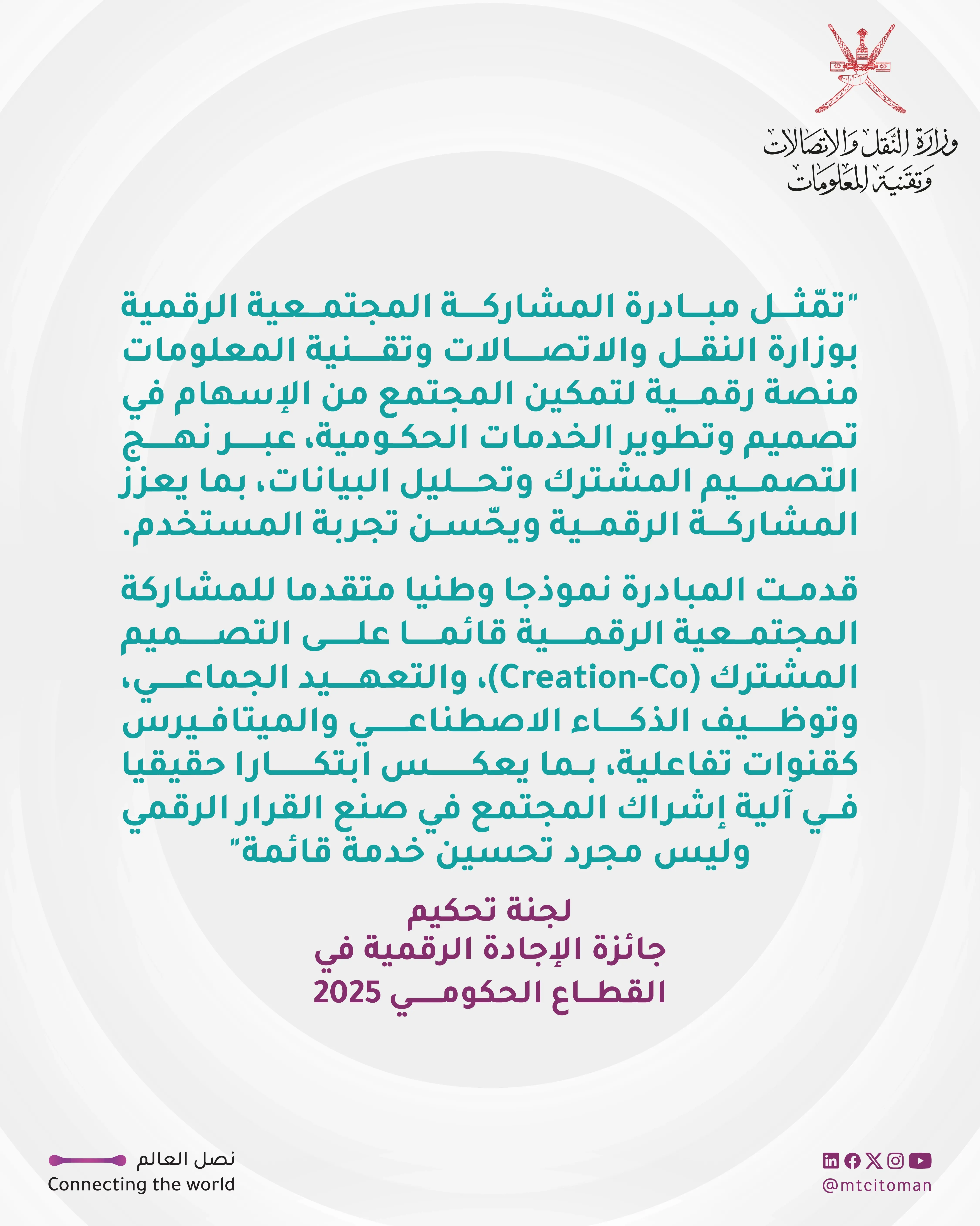 The digital community participation initiative by the Ministry of Transport, Communications, and Information Technology was represented by a digital platform that enables the community to contribute to the design and development of government services, considering it a co-design and data analysis approach, which enhances digital participation and improves user experience. The judging panel, composed of several specialized experts, praised "the importance of the initiative, considering it an advanced national model for digital community participation based on co-design (Creation-Co), crowdsourcing, and the use of artificial intelligence and the metaverse as interactive channels, reflecting true innovation in the mechanism of involving the community in digital decision-making rather than merely improving an existing service."